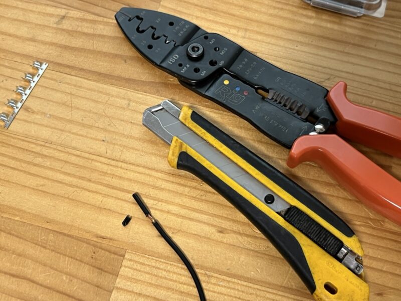 配線を剥いて、巻きつけ、ハンダに変更します。初めてやる作業のため、単線で練習します。