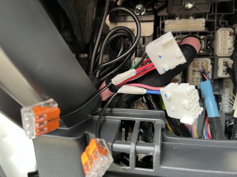 車両側のハーネスを加工。被覆を剥いて、巻き付けて、ハンダ付け。分岐は最近よく使うWAGOのワンタッチ分岐を使います。