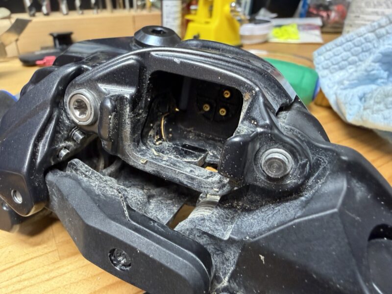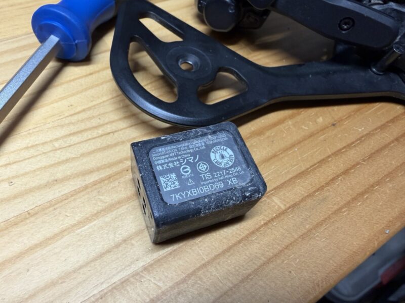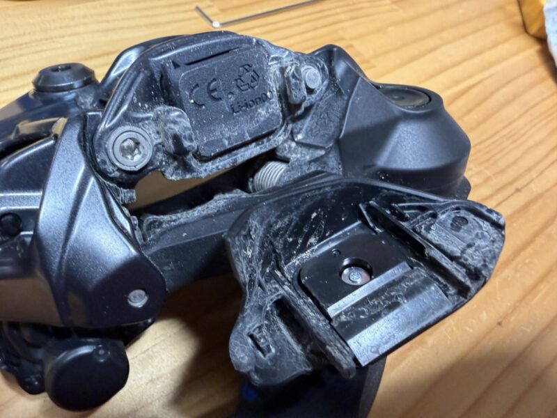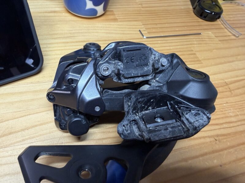 2025年夏に導入した新型XTのリアディレイラーです。Di2でバッテリーも積んでいるのでかなり大きめ。こちらも王滝の砂がこびりついてます。プーリーケージは簡単にばらせるので、バラして拭き掃除。
