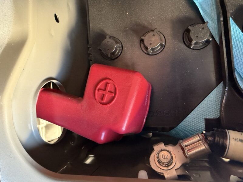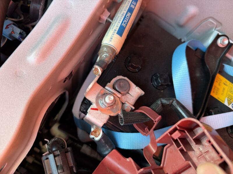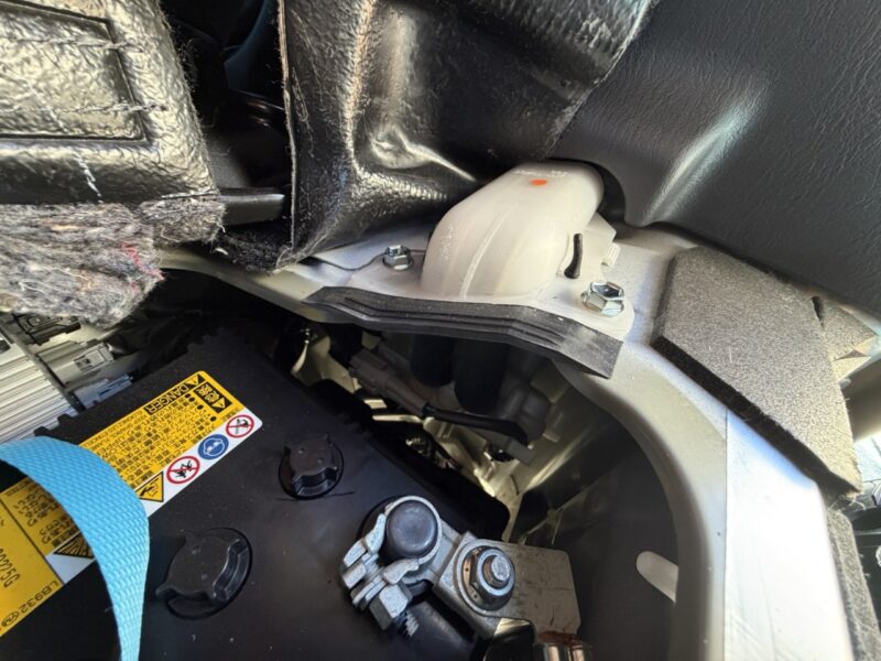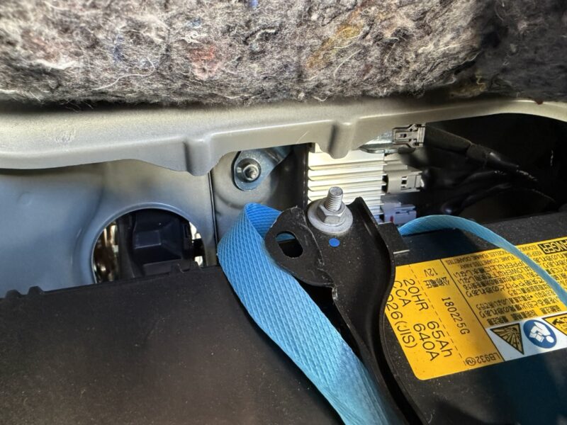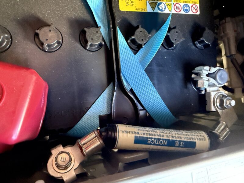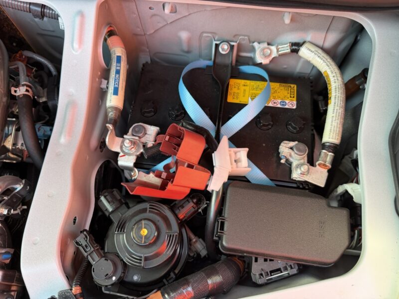 助手席を下のエンジンカバーを開けるとバッテリーがいます。