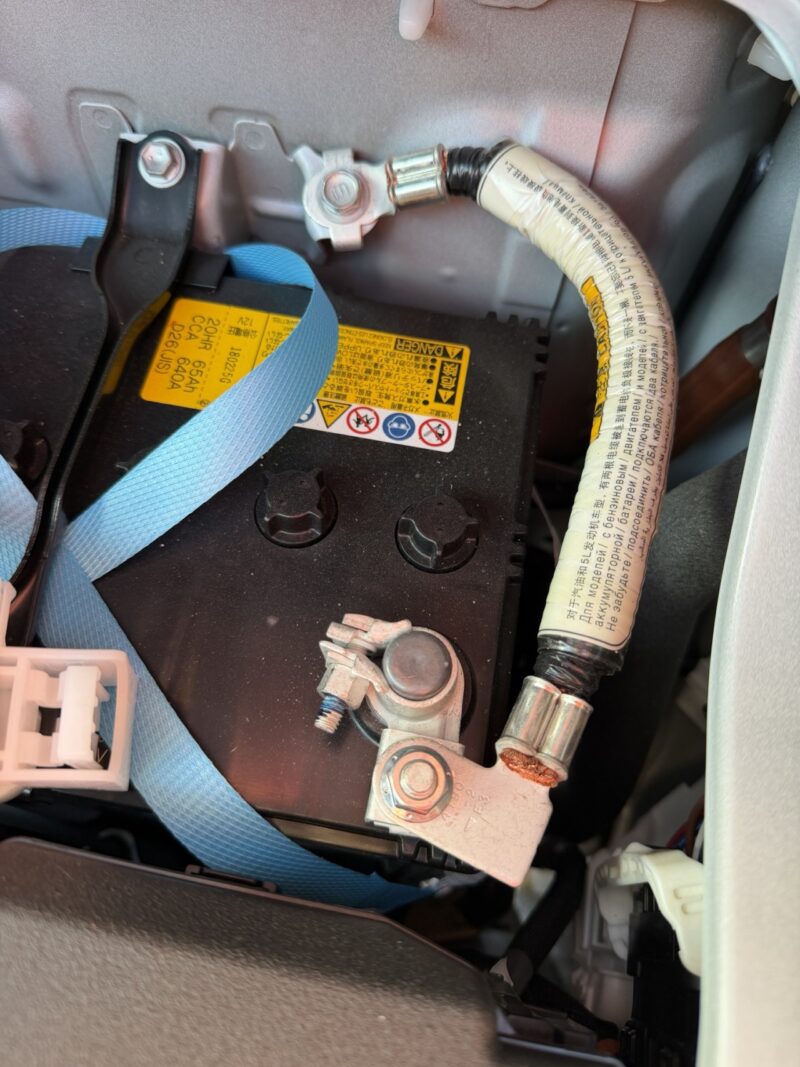 バッテリー周りの覚え書き、寒冷地仕様なので2個載ってます。バッテリーから直接電源を引き出すための下調べです。