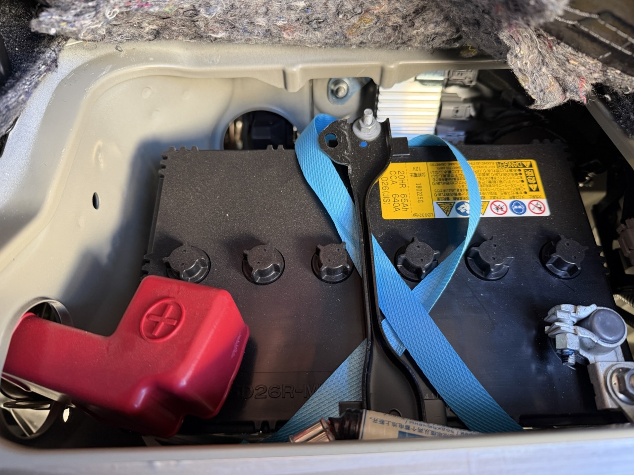 助手席を下のエンジンカバーを開けるとバッテリーがいます。